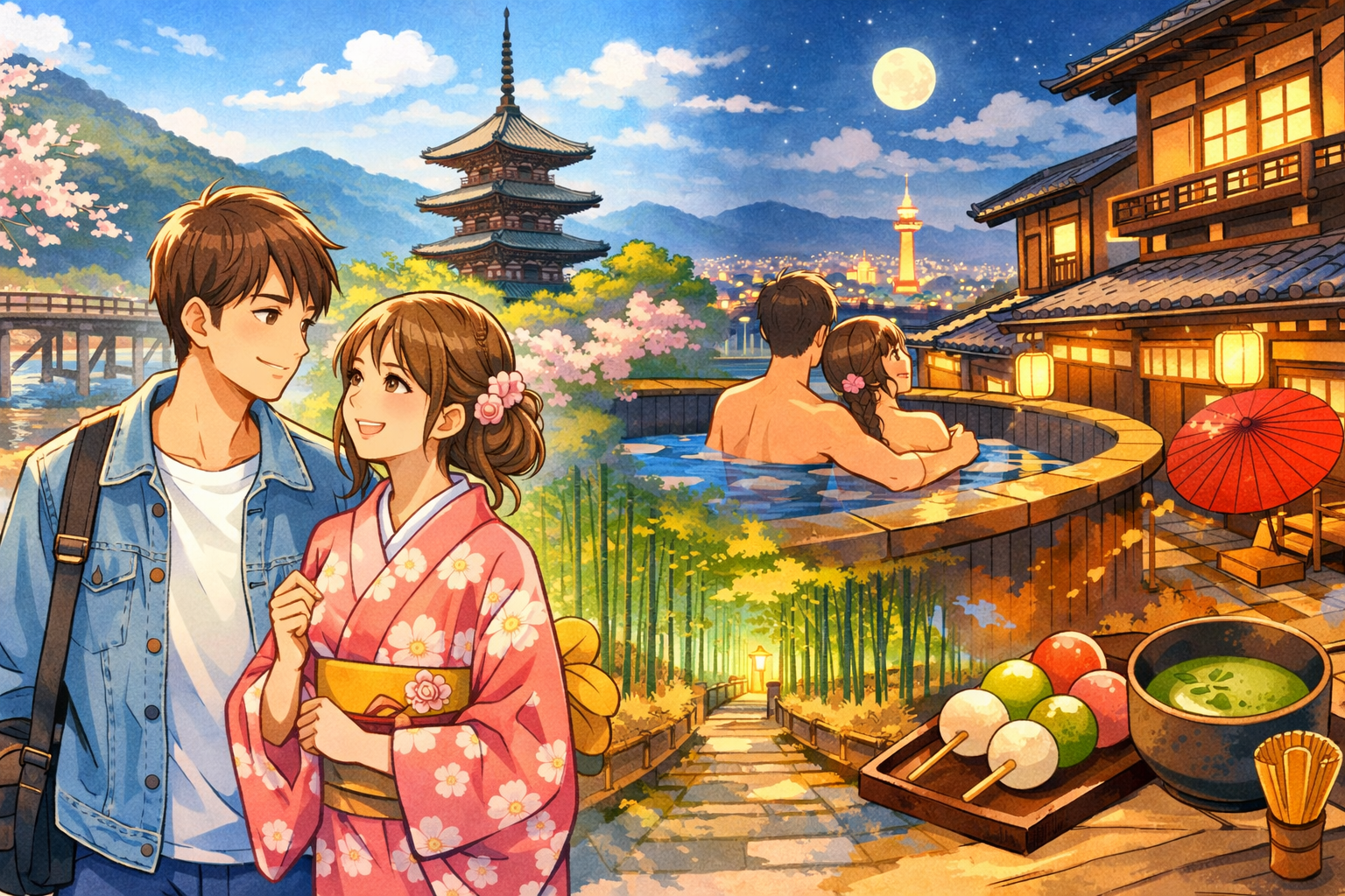 昼は清水寺や嵐山、祇園など京都らしい観光を楽しみ、夜は温泉でゆったり過ごす。そんな贅沢な旅行プランは、京都だからこそ叶うデートの楽しみ方です。忙しい日常を少し離れて、ふたりだけの特別な時間を過ごしてみてはいかがでしょうか。